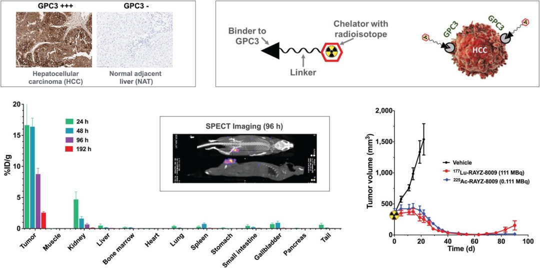 2024年,相關研究結果數據開始釋放。據公開資料顯示DOTA-RYZ-GPC3 (RAYZ-8009)由PeptiDream開發的環肽、連接子和螯合劑三部分組成,可與不同的放射性同位素結合,達到診療一體化的目的。臨床前研究結果顯示RAYZ-8009與人、小鼠、犬和食蟹猴的GPC3蛋白具有較高的結合親和力,與其他Glypican家族成員無結合。在GPC3陽性的HepG2細胞中證實了有效的細胞結合與有效的內化,該結合并不受同位素更換的影響。177Lu-RAYZ-8009的生物分布研究表明,腫瘤顯示出持續攝取和代謝器官腎臟的快清除,其他正常組織幾乎沒有攝取。原位肝細胞癌組織也表現出腫瘤特異性攝取,而健康肝組織未見攝取。在GPC3陽性HCC荷瘤模型中,177Lu-和225Ac標記的RAYZ-8009單藥治療和與lenvatinib聯合治療均獲得了顯著且持久的腫瘤消退和生存獲益。