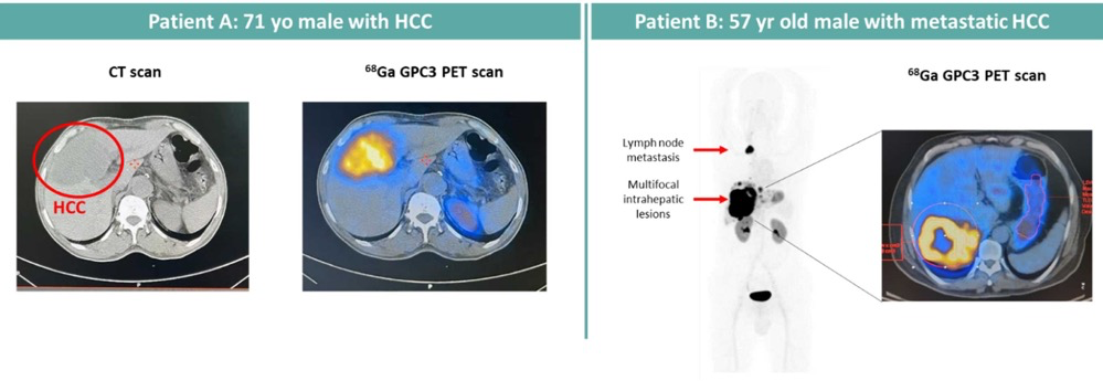 2024年6月起,臨床研究結果陸續披露。在去年SNMMI會議投稿的摘要信息顯示:研究掃描了 15 名患者(5 名動態患者;10 名靜態患者),一名疑似患有 HCC 的患者在隨訪期間并未出現 HCC。另一名患者同時患有轉移性前列腺腺癌,但在定性和定量方面均未顯示攝取(SUV 值小于 1.0),經免疫組化證實,同一患者(患有前列腺癌)的三個 HCC 病灶被認為是 GPC3 陰性;PET/CT 上的 HCC 病灶內 GPC3 表達不均,說明了疾病的異質性。在定性評估中,大多數已知、疑似或不確定的 HCC 病灶都顯示出攝取。總共有 38 個 HCC 病變在不同的時間點進行了成像,包括上述 GPC3 陰性病變。在 60 分鐘時,平均 SUVmax 為 20.0(范圍為 2.7 - 95.3),平均 SUVmean 為 10.2(范圍為 1.0 - 49.2)。隨著時間的推移,健康肝臟和血池的攝取量迅速下降,在用藥 45 分鐘后變得較低(SUVmean <1.6),并呈持續下降趨勢,直至用藥 4 小時后(平均 SUVmean = 1.0)。而 HCC 和 TLR 的情況恰恰相反,它們在用藥后 4 小時內持續上升(注射后 18 分鐘、1 小時和 4 小時的平均 TLR 分別為 5.5、8.9 和 19.2)。在單個病灶分析中,TLR 在注射后 60 - 120 分鐘之間最高。胃壁的攝取量在第一小時內逐漸增加,之后逐漸減少(注射后18分鐘、1小時和4小時的平均SUVmean分別從18.9到22.6,再回到14.9)。