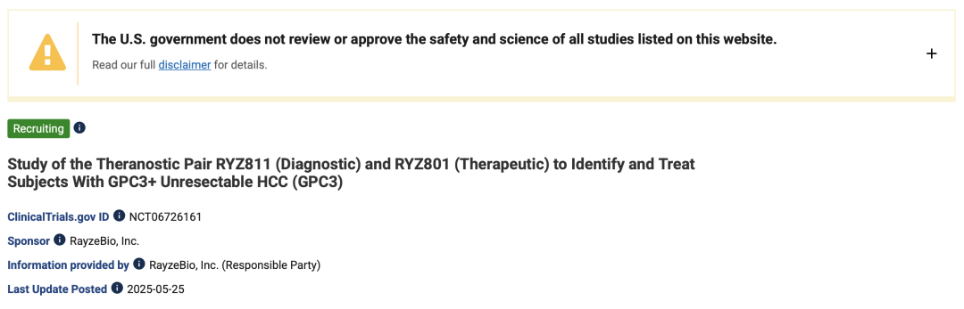 該藥物的研發歷程始于2022年12月6日首次披露,隨后在2023年6月1日完成首個轉化醫學研究。關鍵的臨床開發階段于2024年12月10日正式啟動,通過登記I/1b期單臂開放標簽試驗(NCT06726161),評估225Ac-RAYZ-8009與68Ga-RYZ-GPC3這對診療一體化組合在肝細胞癌中的應用。研發方RayzeBio, Inc.于2024年12月12日獲得首個化合物/序列專利。當前全球最高研發階段為I期臨床(Active狀態),研究周期為2023年6月1日至2031年1月1日,主要在美國開展。小編將持續關注并及時更新最新研究進展,實時報道。