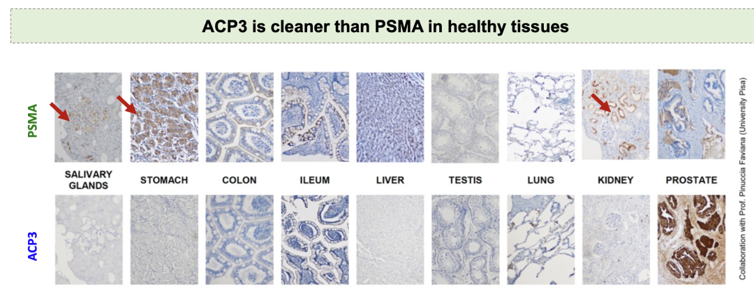 酸性磷酸酶3(ACP3)在癌性前列腺組織中高度表達,而在絕大多數正常器官(包括健康前列腺)中幾乎無法檢測,展現出比當前主流靶點PSMA更強的腫瘤特異性。PSMA雖然在唾液腺、胃腸道和腎臟等正常組織中也有表達,但其表達水平通常比前列腺癌細胞低100-1000倍,且多位于非直接接觸血液循環的部位。相比之下,ACP3具有更低的非靶組織攝取和更高的腫瘤表達量,在“干凈性”與“靶向效率”兩方面均顯著優于PSMA,使其成為前列腺癌診療中更具潛力的新型靶點。