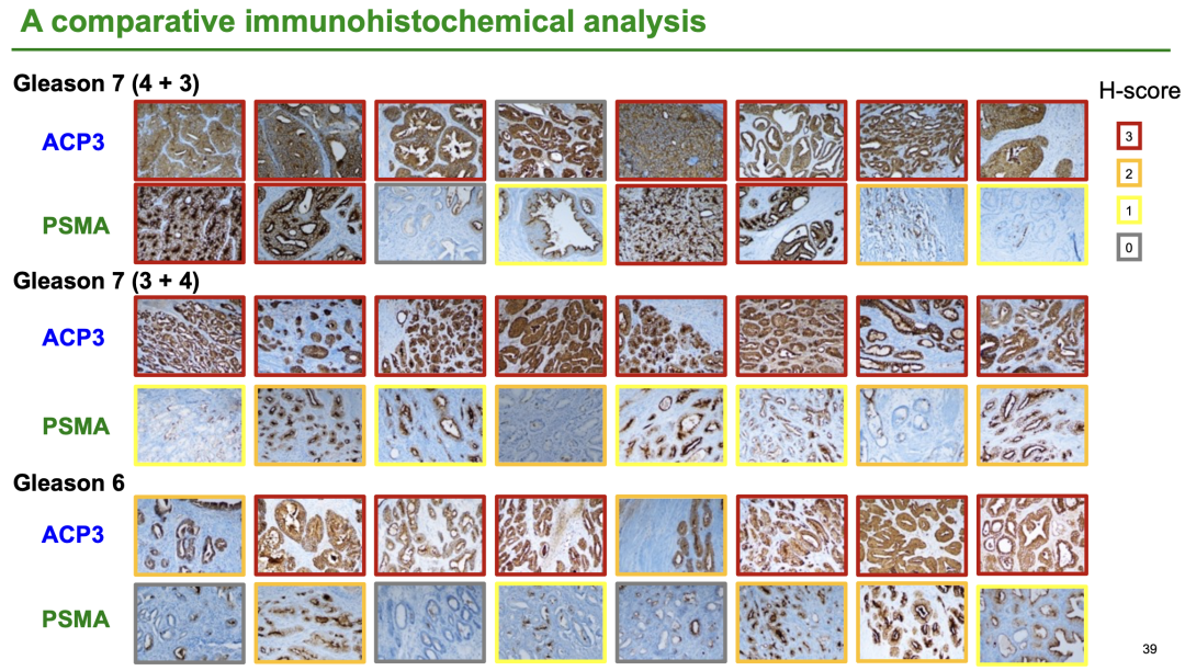 Philochem最新研究采用免疫組化技術(IHC)對39例前列腺癌患者的連續組織切片進行系統分析,通過同步檢測PSMA與ACP3的表達特征,發現兩者在不同Gleason評分腫瘤中存在顯著差異。研究顯示:87%(34/39)的樣本呈現ACP3強陽性表達(H-score=3),而PSMA的強陽性率僅為23%(9/39)。這一發現表明,相較于PSMA,ACP3在前列腺癌組織中可能具有更廣泛且穩定的表達特征,提示其作為前列腺癌診斷或治療靶點的潛在生物標志物價值值得進一步研究