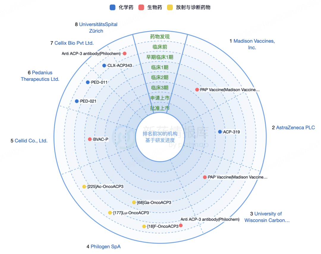 目前,針對酸性磷酸酶3(ACP3)靶點的前列腺癌治療和診斷產品尚未有獲批上市的藥物,但有多款處于臨床研究階段的候選藥物。