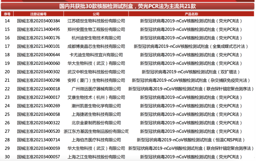 目前國內廠商已獲批30款核酸檢測試劑盒,主要選擇熒光PCR方法,靶標位點大部分在兩個以上。未來仍將是主要的新冠肺炎檢測手段。抗原檢測作為核酸檢測的有力補充,可用于居家檢測,近期對于新冠抗原試劑盒更是開放了政策,進一步證明了其較好的市場前景。