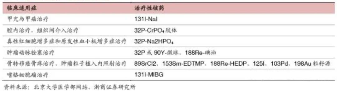 治療用核藥種類較多,其中碘-131用于治療甲亢的應用時間較久,碘-131在進入甲狀腺后通過釋放β與γ射線對甲狀腺進行輻照從而達到減少甲狀腺激素分泌,緩解甲亢的效果。國內治療用核藥已經在鍶-89、釤-153、錸-188緩解骨轉移癌的疼痛,釔-90微球用于肝動脈介入治療原發性或轉移性肝癌,碘-125、鈀-103等放射性密封籽源治療難治性實體腫瘤,碘-131、釔-90Y等放射性核素標記的單克隆抗體等生物分子藥物用于霍金斯淋巴瘤和實體瘤的治療等諸多領域都取得了長足進展。
