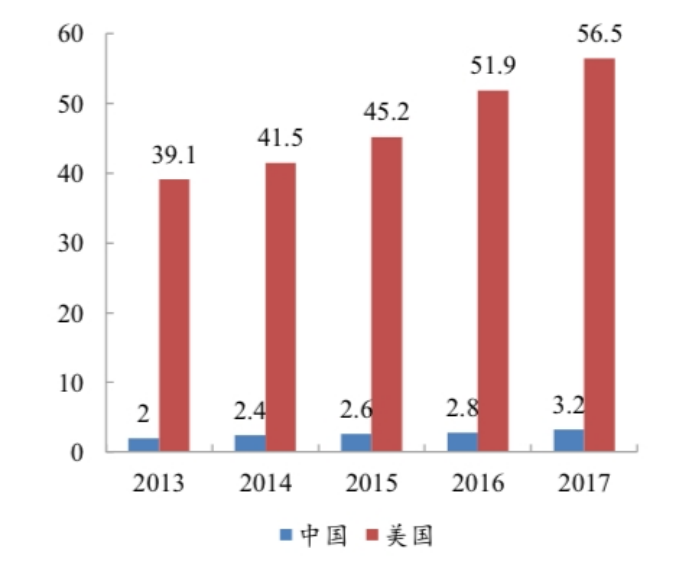 根據行業報告,預計2022年同位素醫療應用市場規模將達到106.34億元,放射源產品將達到5.35億元,預計分別較2017年實現19.4%和4.4%的復合增長率。同時,同美國人均核醫學支出對比,2017年美國實現人均56.5元的核醫學支出,而我國人均僅為3.2元,遠低于美國水平,市場潛力存在巨大空間。