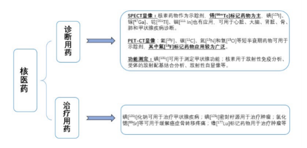核醫學是將核科學技術應用于疾病的診斷和治療的學科,其臨床應用非常廣泛,其中診斷應用包括腫瘤、心腦血管、神經、骨骼等多種顯像診斷;治療應用包括甲狀腺疾病、腫瘤治療、靶向治療等。核醫學使用的含有放射性核素的特殊藥物即為核藥。