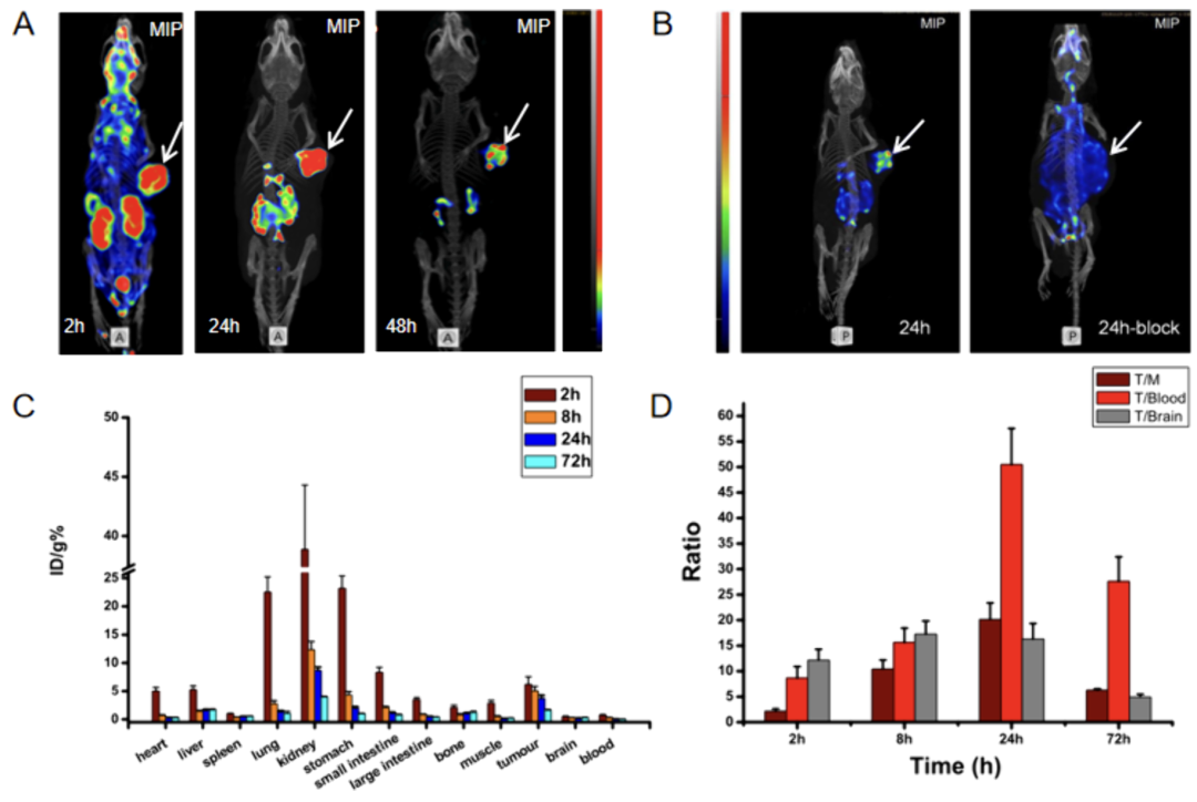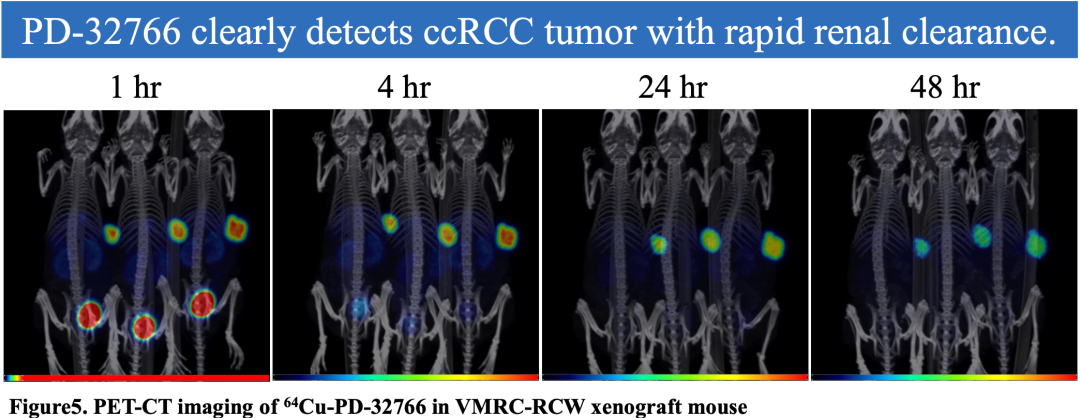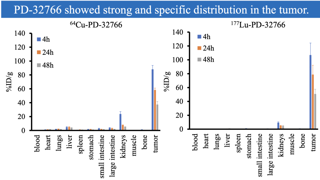 此前披露的數據顯示,PD-32766、63Cu-PD-32766 和 175Lu-PD-32766 (natCu、natLu)對CA9的親和力小于0.2 nM。在體內生物分布實驗中,64Cu-PD-32766 和 177Lu-PD-32766 在給藥后4小時在腫瘤中表現出特異性的高攝取(64Cu-PD-32766 和 177Lu-PD-32766 分別為 88% 和 107% ID/g),并且在給藥后 48 小時在腫瘤中持續高保留(64Cu-PD-32766 和 177Lu-PD-32766 分別為 37% 和 51% ID/g)。其他正常組織中的最大攝取分別為 23% ID/g 和 9%ID/g(4小時后64Cu-PD-32766和 177Lu-PD-32766 的腫瘤/腎臟比為3.8和11.9)。在治療實驗中,177Lu-PD-32766(30 MBq/小鼠單次或QW x3)具有良好的耐受性,與對照組相比,給藥后45天的小鼠存活率顯著提高,這表明177Lu-PD-32766具有強大的腫瘤生長抑制作用。