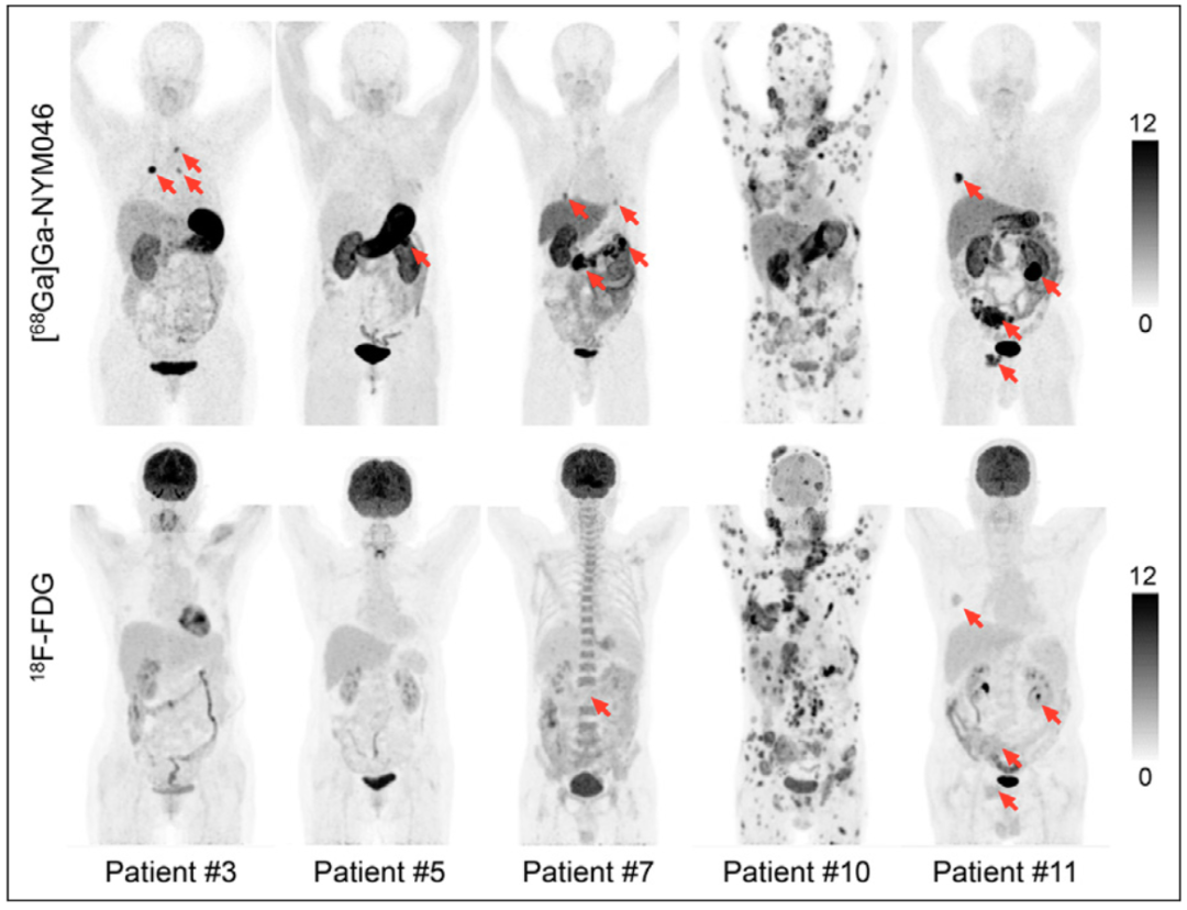 本圖展示了5名患者(患者3、5、7、10和11)的代表性最大強度投影(maximum-intensity projections,MIPs)圖像,這些圖像比較了[68Ga]Ga-NYM046 PET/CT和18F-FDG PET/CT的結果。在這些圖像中,兩種示蹤劑都顯示了在骨骼和淋巴結轉移中的特異性攝取(患者10和11),[68Ga]Ga-NYM046 PET/CT在檢測原發腫瘤、肺轉移和胸膜轉移方面的表現優于18F-FDG PET/CT(患者3、5、7和11)。