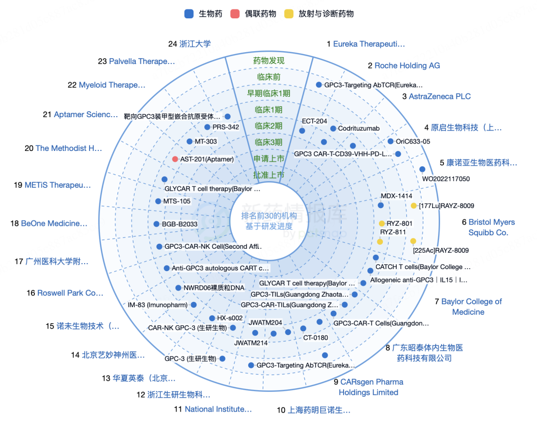 目前全球范圍內尚未有GPC3靶向藥物獲批上市。在肝癌治療領域,RayzeBio采取差異化競爭策略,獨辟蹊徑地選擇了Glypican-3(GPC3)這一極具潛力的創新靶點。GPC3作為肝癌特異性生物標志物,在超過70%的肝細胞癌中呈現高表達,而在正常組織中幾乎不表達,這種獨特的表達譜使其成為理想的治療靶點。