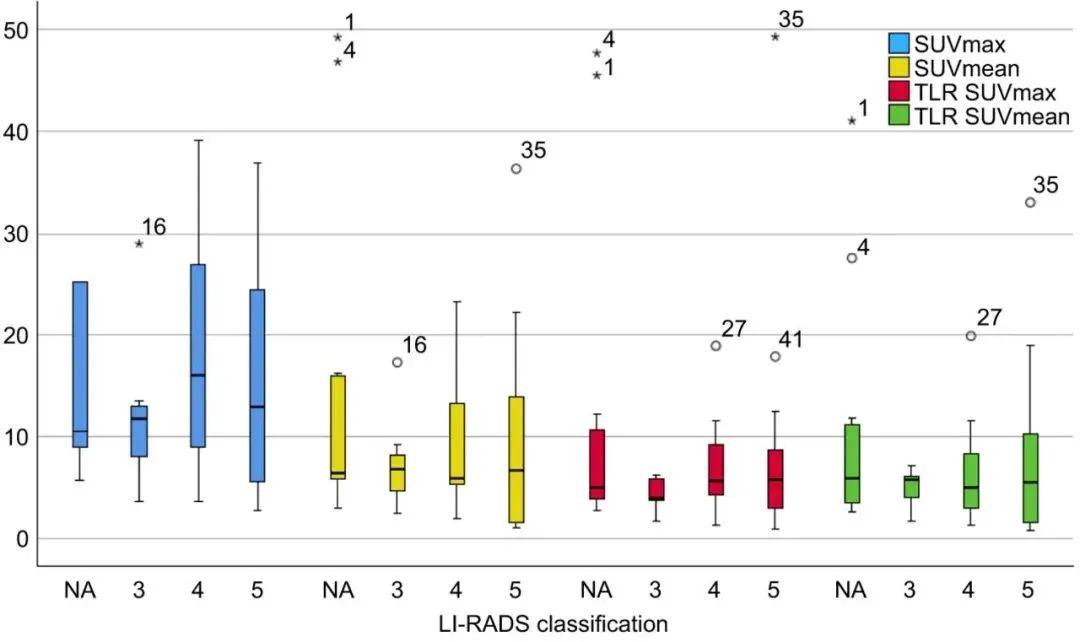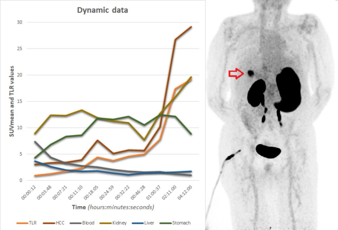 2024年6月起,臨床研究結果陸續披露。在去年SNMMI會議投稿的摘要信息顯示:研究掃描了 15 名患者(5 名動態患者;10 名靜態患者),一名疑似患有 HCC 的患者在隨訪期間并未出現 HCC。另一名患者同時患有轉移性前列腺腺癌,但在定性和定量方面均未顯示攝取(SUV 值小于 1.0),經免疫組化證實,同一患者(患有前列腺癌)的三個 HCC 病灶被認為是 GPC3 陰性;PET/CT 上的 HCC 病灶內 GPC3 表達不均,說明了疾病的異質性。在定性評估中,大多數已知、疑似或不確定的 HCC 病灶都顯示出攝取。總共有 38 個 HCC 病變在不同的時間點進行了成像,包括上述 GPC3 陰性病變。在 60 分鐘時,平均 SUVmax 為 20.0(范圍為 2.7 - 95.3),平均 SUVmean 為 10.2(范圍為 1.0 - 49.2)。隨著時間的推移,健康肝臟和血池的攝取量迅速下降,在用藥 45 分鐘后變得較低(SUVmean <1.6),并呈持續下降趨勢,直至用藥 4 小時后(平均 SUVmean = 1.0)。而 HCC 和 TLR 的情況恰恰相反,它們在用藥后 4 小時內持續上升(注射后 18 分鐘、1 小時和 4 小時的平均 TLR 分別為 5.5、8.9 和 19.2)。在單個病灶分析中,TLR 在注射后 60 - 120 分鐘之間最高。胃壁的攝取量在第一小時內逐漸增加,之后逐漸減少(注射后18分鐘、1小時和4小時的平均SUVmean分別從18.9到22.6,再回到14.9)。