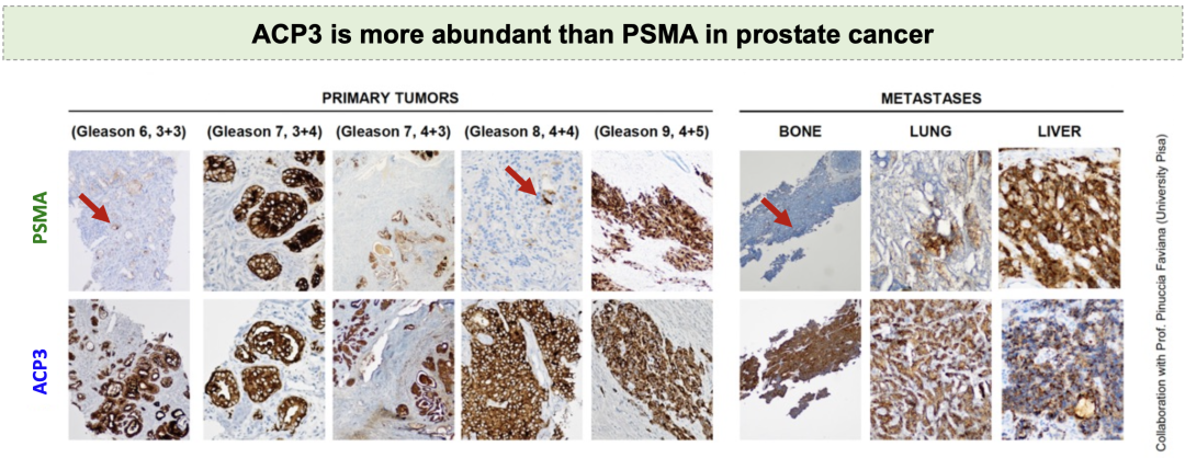 酸性磷酸酶3(ACP3)在癌性前列腺組織中高度表達,而在絕大多數正常器官(包括健康前列腺)中幾乎無法檢測,展現出比當前主流靶點PSMA更強的腫瘤特異性。PSMA雖然在唾液腺、胃腸道和腎臟等正常組織中也有表達,但其表達水平通常比前列腺癌細胞低100-1000倍,且多位于非直接接觸血液循環的部位。相比之下,ACP3具有更低的非靶組織攝取和更高的腫瘤表達量,在“干凈性”與“靶向效率”兩方面均顯著優于PSMA,使其成為前列腺癌診療中更具潛力的新型靶點。