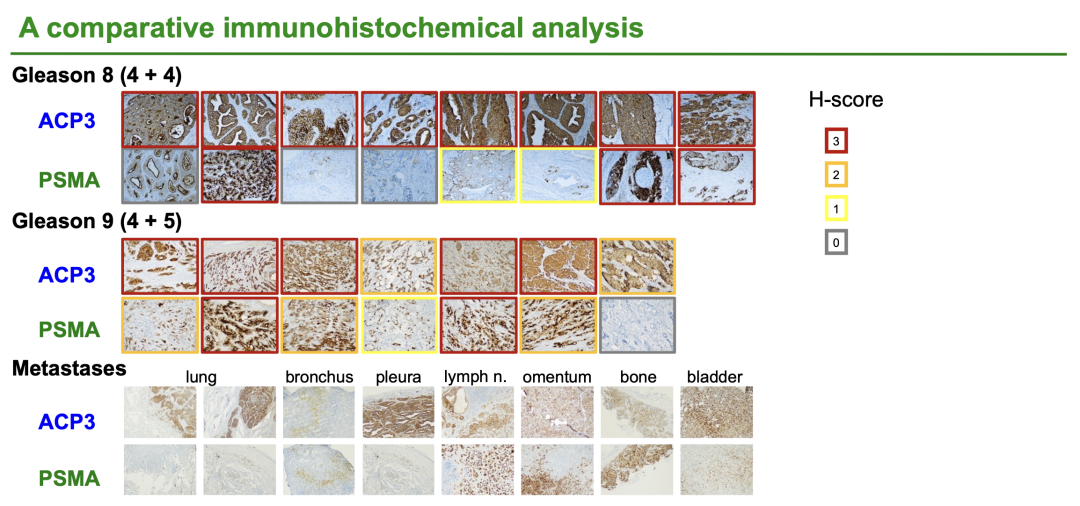 Philochem最新研究采用免疫組化技術(IHC)對39例前列腺癌患者的連續組織切片進行系統分析,通過同步檢測PSMA與ACP3的表達特征,發現兩者在不同Gleason評分腫瘤中存在顯著差異。研究顯示:87%(34/39)的樣本呈現ACP3強陽性表達(H-score=3),而PSMA的強陽性率僅為23%(9/39)。這一發現表明,相較于PSMA,ACP3在前列腺癌組織中可能具有更廣泛且穩定的表達特征,提示其作為前列腺癌診斷或治療靶點的潛在生物標志物價值值得進一步研究