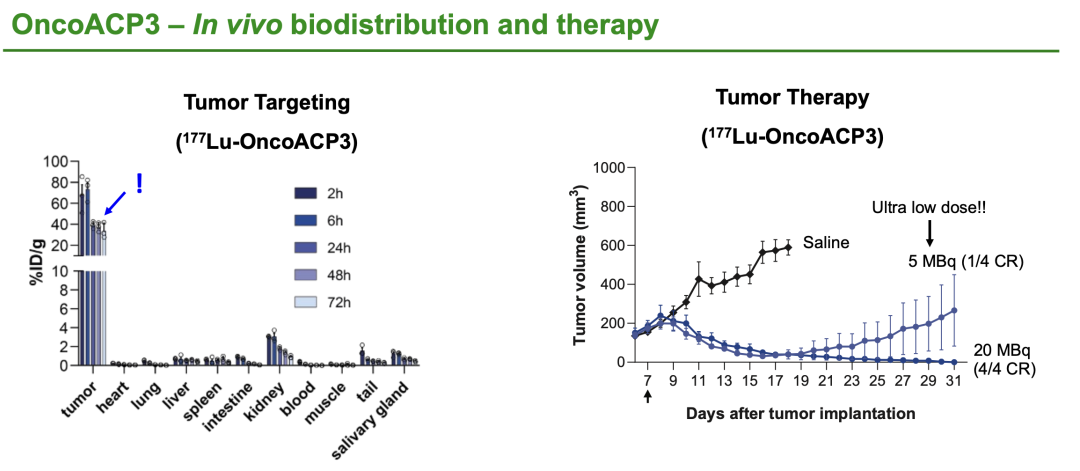 目前Philogen集團旗下瑞士子公司Philochem AG已完成化合物的篩選、專利申請與布局、并在臨床前的研究中證實了新核藥的安全性與有效性:如上圖所示,OncoACP3在荷瘤小鼠模型中顯示出極低的非靶器官攝取(如腎臟、唾液腺),而177Lu-OncoACP3在低劑量(5–20 MBq/小鼠)下即表現出顯著抗腫瘤活性,且未觀察到傳統PSMA靶向療法的毒性問題。