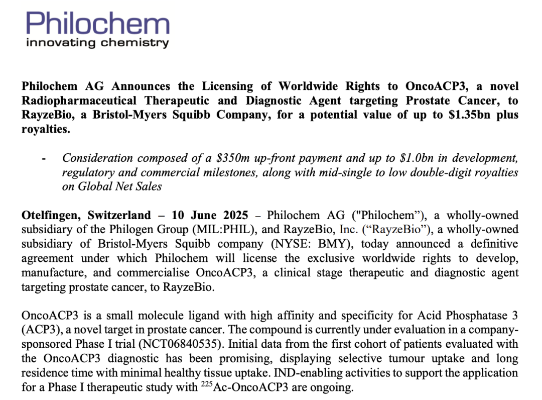 2025年6月10日,Philochem AG與百時美施貴寶(BMS)全資子公司RayzeBio正式達成一項價值高達13.5億美元的全球授權協議。根據協議條款,Philochem將獲得3.5億美元預付款及最高10億美元的里程碑付款,外加全球凈銷售額的中個位數至低雙位數(5%~12%)特許權使用費。