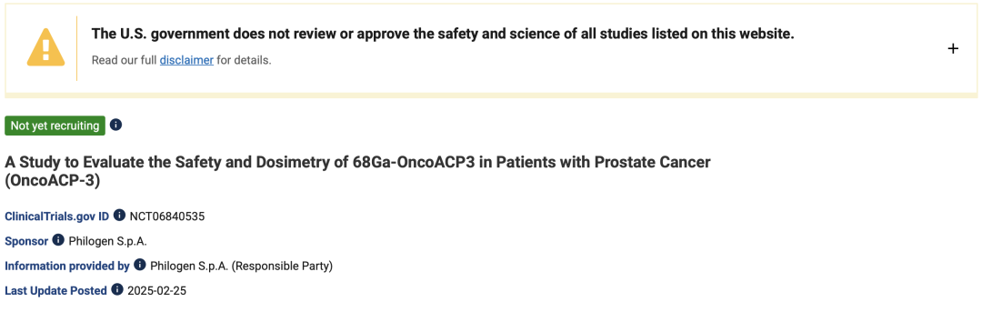 該交易授權RayzeBio獨家開發、生產和商業化靶向前列腺癌新靶點ACP3的放射性藥物OncoACP3:診斷核藥(68Ga-OncoACP3)目前處于I期試驗(NCT06840535),旨在評估其在前列腺癌患者中的安全性、劑量學和生物分布特性。該試驗于2025年2月在意大利3個研究中心啟動,計劃招募20例患者,預計同年12月完成入組。初步數據已顯示優異的腫瘤選擇性和診斷潛力;治療核藥(225Ac-OncoACP3)目前IND-enabling進行中,計劃推進至治療性I期臨床。交易預計將于2025年第三季度完成,需滿足常規成交條件及監管批準。